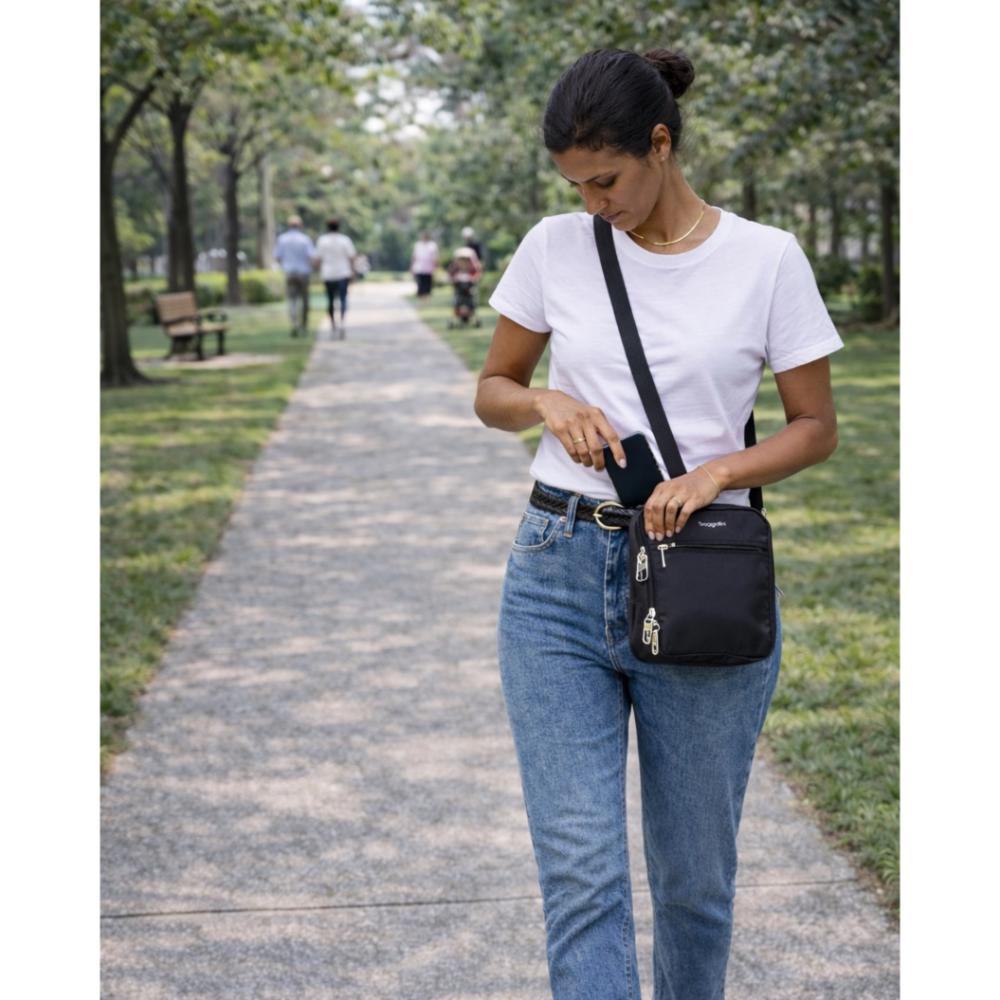 Locking zippers, cut-resistant double-cable straps, and built-in RFID-protection—enjoy all of our Securtex® anti-theft features in a compact, lightweight crossbody bag. This mini but mighty style also features a handy lipstick loop and key leash to help you find your essentials easily while you’re on the go.